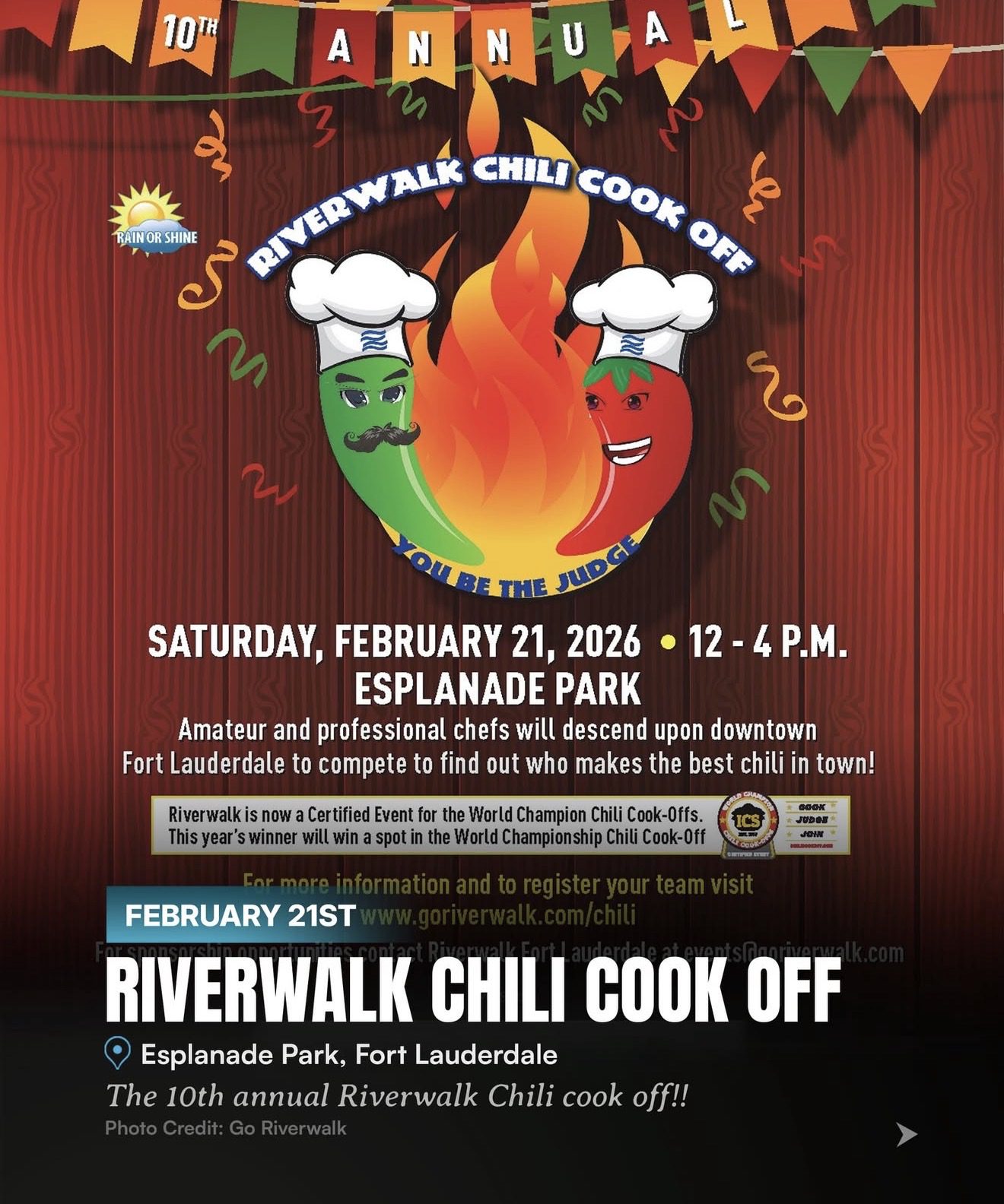 Things are heating up in downtown Fort Lauderdale at the 10th Annual Riverwalk Chili Cook-Off! Join us at Esplanade Park for an afternoon of flavor, fun, and friendly competition along the river.